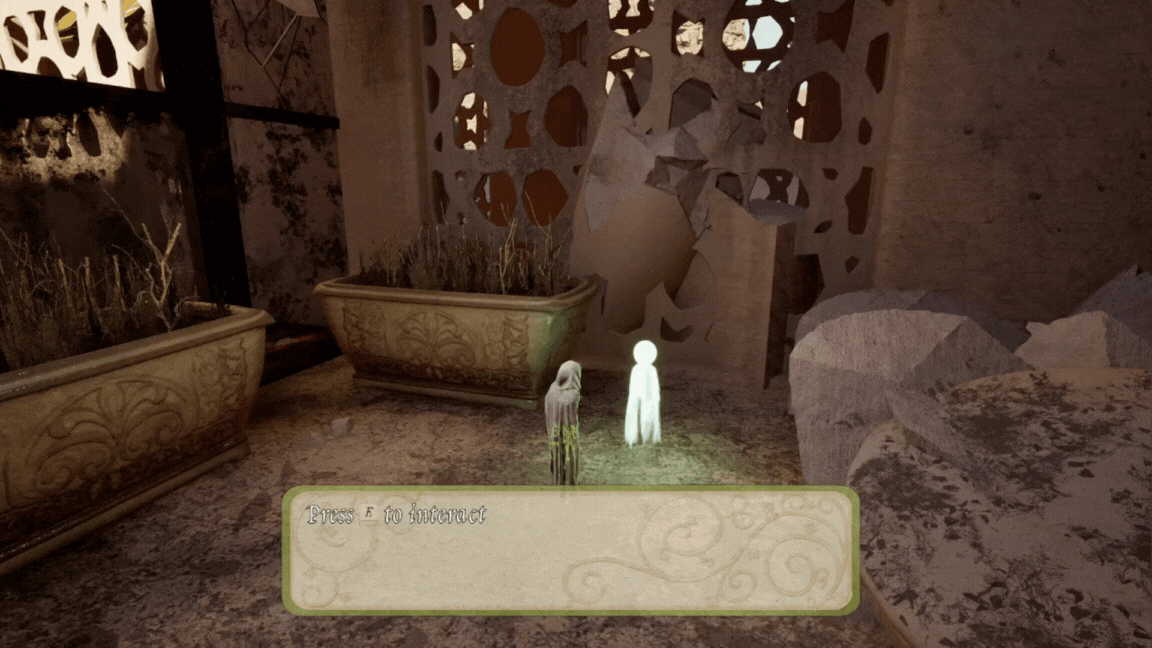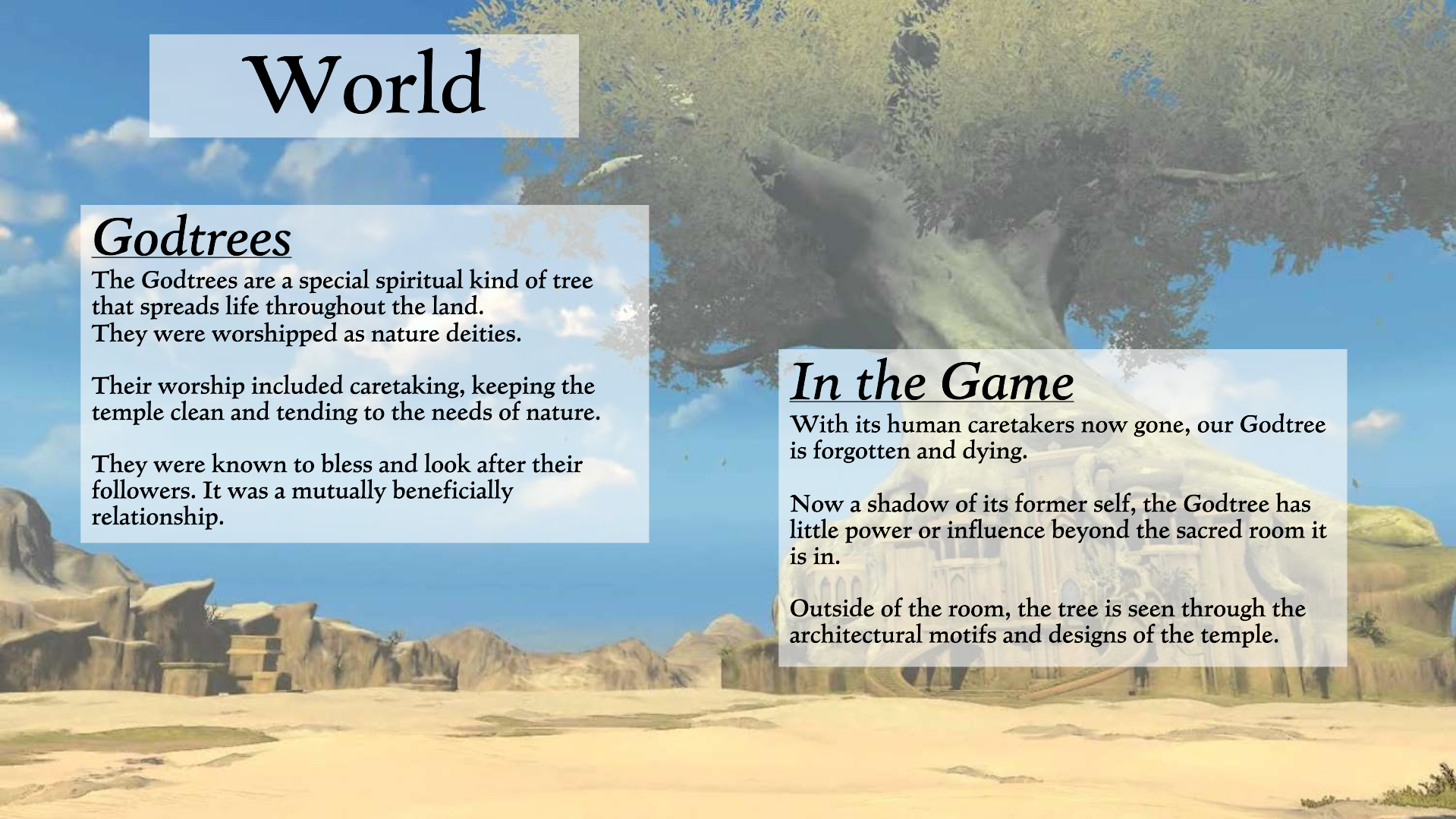 We chose to use NPC spirits that we placed around the temple. The player is able to interact with them, hearing what they have to say. We strategically placed spirits with tutorial information along the Golden Path and placed more flavorful spirits in nooks and side areas to reward exploration.