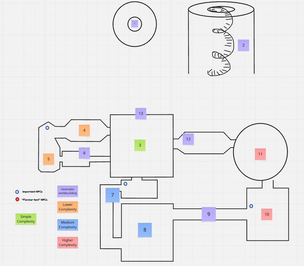 From a narrative perspective, our goal with the level was to use it as a microcosm of the bigger world story. In each section we wanted everything, NPCs, art direction, and gameplay mechanics, to match a tone and be able to tell a story through subtler methods than dialogue.